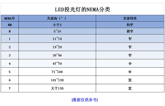 LED投光燈在水平方向和垂直方向上的光束角有可能不同。美國(guó)電氣制造聯(lián)合會(huì)(NEMA,National Electrical Manufactures Associa-tion) 根據(jù)光束角的大小將投光燈分成9種,如下圖: