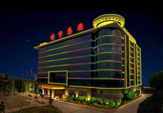 博宇集團(tuán)是一家水族器材、園林造景配套器材及寵物用研發(fā)、銷售一體的高新技術(shù)企業(yè),其主體辦公大樓更是周邊的地標(biāo)性建筑。此次亮化工程是屬于換新項(xiàng)目,以前的效果是用白光的高壓PC護(hù)欄管做的一個(gè)輪廓,效果比較單調(diào),并且由于很多護(hù)欄管防水沒(méi)做好,壞了很多,所以需要更換全新的亮化燈具。