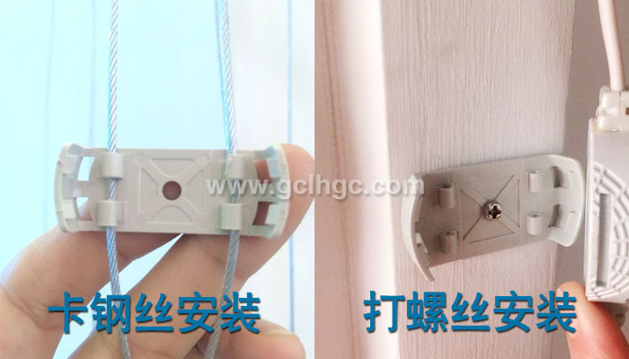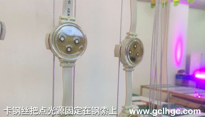 (1)卡鋼絲固定安裝:對于卡鋼絲安裝相信大家也不陌生了吧,聽了很多但是可否有親眼目睹過實際的安裝模樣呢,圖片上所示的就是卡鋼絲安裝所用的材料和效果。鋼絲固定安裝主要針對一些玻璃幕墻的建筑樓體,玻璃與墻體之間拉下鋼索后對點光源進行固定。