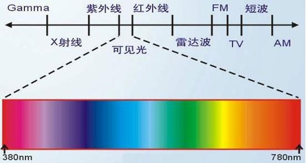 而對(duì)正常人來(lái)說(shuō),眼睛可以感知的電磁波(可見(jiàn)光)的波長(zhǎng)在400-700nm之間,對(duì)波長(zhǎng)約為555nm的電磁波最為敏感,這個(gè)恰恰是綠光范圍內(nèi),在這個(gè)適當(dāng)?shù)牟ㄩL(zhǎng)逐漸向兩個(gè)方向越遠(yuǎn)感應(yīng)度越低。