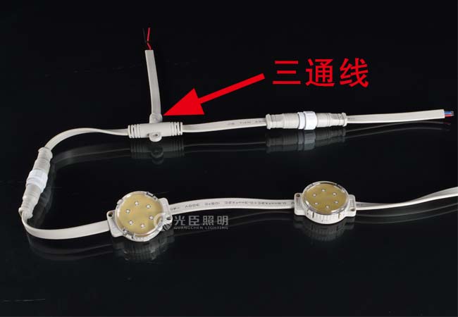 二、三通線串接安裝:每?jī)纱甃ED像素?zé)舸溆幸粭l與之連接的三通線,延伸出來(lái)的三通線可與信號(hào)線、電源線相接。安裝極為方便。