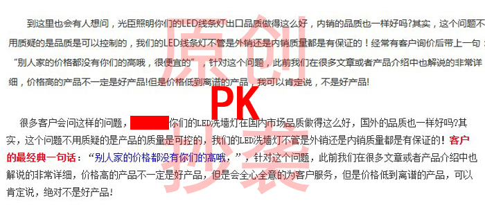 瀏覽:-我們年輕,我們敢創(chuàng)新,這是光臣人的作風(fēng),光臣照明因為早在8年前就開始生產(chǎn)洗墻燈,在行內(nèi)的名氣較大,所以一直以來所生產(chǎn)的產(chǎn)品都是被模仿的對象,近期發(fā)現(xiàn),就連光臣官司方網(wǎng)站的文章都不斷的被同行抄襲,甚至照搬。